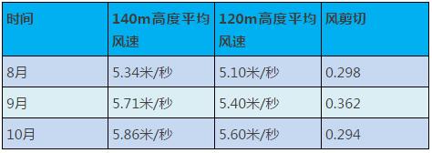 為對比120米高度和140米高度的運行情況,剔除運維檢修參觀等停機時間段,保留120米和140米共同發(fā)電的時間,從8-10月的統(tǒng)計數(shù)據(jù)來看,140米風機發(fā)電量比120米發(fā)電量分別高19.08%、18.24%、13.27%。