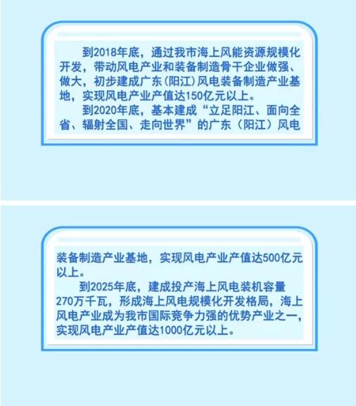 到2020年底,基本建成“立足陽江、面向全省、輻射全國、走向世界”的廣東(陽江)風(fēng)電裝備制造產(chǎn)業(yè)基地,實現(xiàn)風(fēng)電產(chǎn)業(yè)產(chǎn)值達500億元以上。