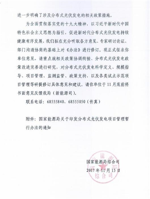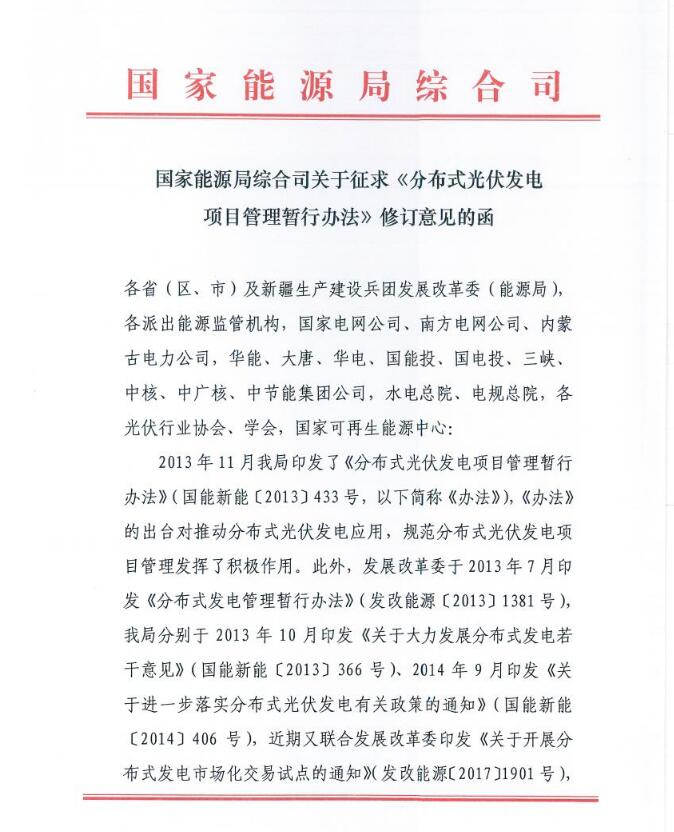 11月17日,國家能源局發(fā)布關(guān)于征求《分布式光伏發(fā)電項(xiàng)目管理暫行辦法》修訂意見的函,詳情如下: