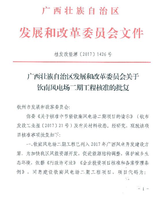 近日廣西壯族自治區(qū)發(fā)改委核準(zhǔn)了欽南風(fēng)電場二期工程,項(xiàng)目單位為中節(jié)能欽州風(fēng)力發(fā)電有限公司,項(xiàng)目建設(shè)地點(diǎn)位于欽州市欽南區(qū),建設(shè)容量為80MW,總投資71123萬元。以下為批復(fù)原文: