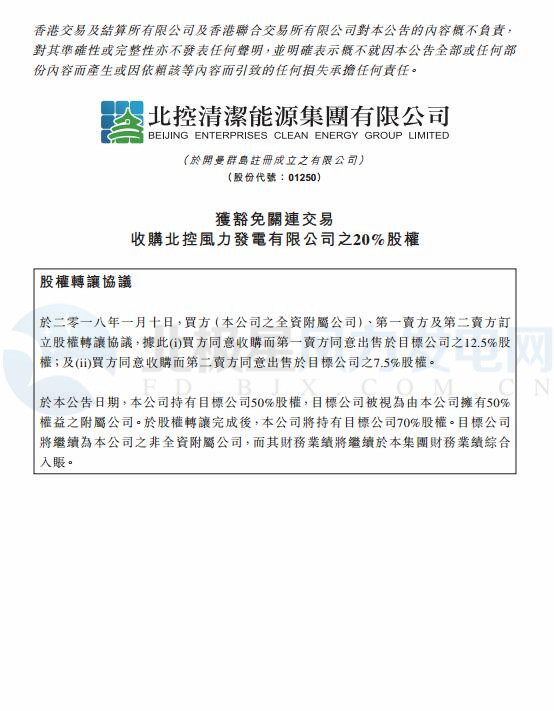2018年1月10日,北控清潔能源全資附屬公司與第一及第二賣(mài)方訂立股權(quán)轉(zhuǎn)讓協(xié)議,同意收購(gòu)第一賣(mài)方同意出售的北控風(fēng)力發(fā)電有限公司12 5%股權(quán);