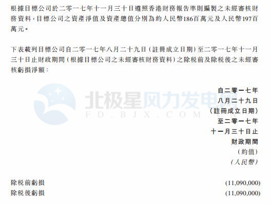 根據(jù)目標(biāo)公司于2017年11月30日遵照香港財(cái)務(wù)報(bào)告準(zhǔn)則編制的未經(jīng)審核財(cái)務(wù)資料,目標(biāo)公司資產(chǎn)凈值及資產(chǎn)總值分別約1.86億元(186百萬(wàn)元)及1.97億元(197百萬(wàn)元)。
