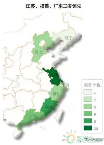 目前,國(guó)內(nèi)海上風(fēng)電的開發(fā)主要還集中在江蘇、福建、廣東三省,其中前者開發(fā)成本較低,后兩者風(fēng)資源更優(yōu)。僅從擁有項(xiàng)目個(gè)數(shù)上來看,江蘇省最多,已建設(shè)、在建、核準(zhǔn)待建項(xiàng)目共計(jì)20個(gè),福建省、廣東省緊隨其后,分別為8個(gè)和6個(gè)。