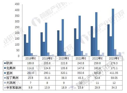 2018-2023年全球分區(qū)域風(fēng)電累計(jì)裝機(jī)容量預(yù)測(cè)(單位:GW)