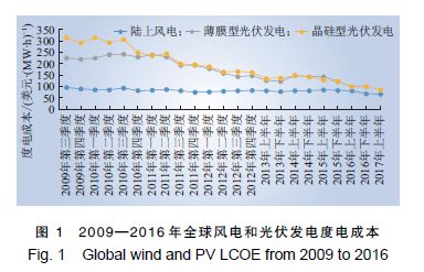 圖1所示為2009—2016年全球風(fēng)電和光伏發(fā)電度電成本