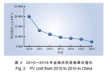 隨著光伏發(fā)電的技術(shù)進(jìn)步、產(chǎn)業(yè)升級和市場規(guī)模擴(kuò)大,中國光伏發(fā)電成本持續(xù)下降,單位容量造價從2010年的約20 000元/kW,降到2016年約7 000元/kW(見圖2)。就具體類型來看,分布式光伏發(fā)電造價比光伏電站高10%~20%。