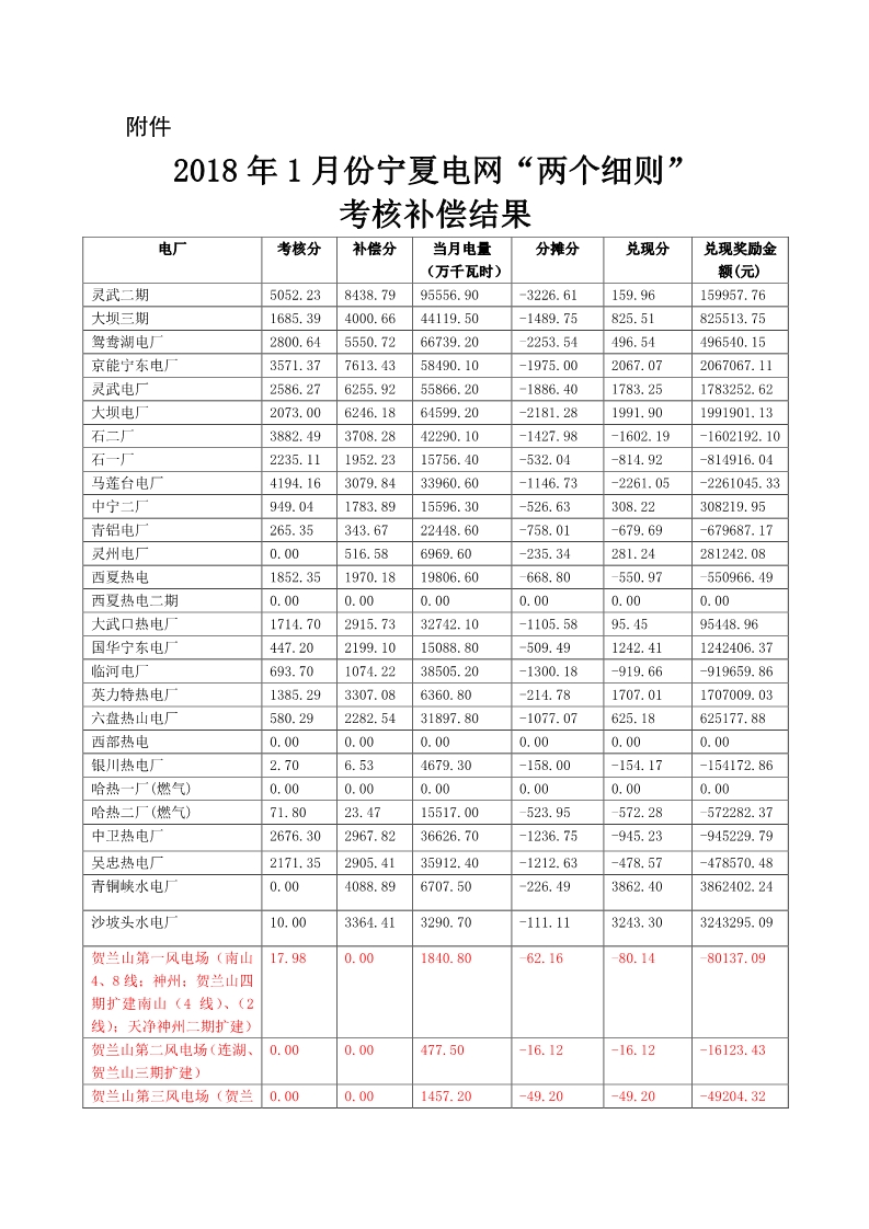 根據(jù)《關(guān)于印發(fā)<西北區(qū)域發(fā)電廠并網(wǎng)運行管理實施細則>及<西北區(qū)域并網(wǎng)發(fā)電廠輔助服務(wù)管理實施細則>的通知》(西北監(jiān)能市場〔2015〕28號)規(guī)定,2018年1月份寧夏電網(wǎng)發(fā)電廠并網(wǎng)考核和輔助服務(wù)補償結(jié)果復核工作已完成,現(xiàn)予公布,請依據(jù)附件結(jié)算。