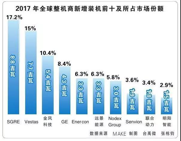 丹麥風能研究和咨詢機構(gòu)MAKE于近日正式發(fā)布《2017年度全球風機整機商市場份額》(以下簡稱 《報告》),對北美、歐洲、中東與非洲、中國及亞