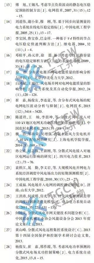 文獻[12-16]研究了變速風電機組接入電網對電壓穩(wěn)定所產生的影響,可采用多種不同的電壓穩(wěn)定性指標來進行判斷。文獻[12]運用基于負荷波動的靜態(tài)電壓穩(wěn)定指標衡量系統(tǒng)電壓的穩(wěn)定程度。文獻[13]則是根據測量到的實時電壓變化來判斷電網電壓波動程度。文獻[14]通過系統(tǒng)固有電壓電流特性快速判別節(jié)點電壓,從而得出節(jié)點電壓波動程度。文獻[15-16]則從短路容量角度對電壓的穩(wěn)定裕度做出判斷。