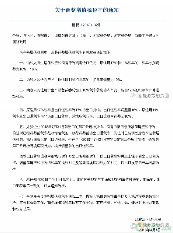 風(fēng)電、光伏項(xiàng)目主要在設(shè)備購(gòu)置環(huán)節(jié)和發(fā)電售電環(huán)節(jié)產(chǎn)生增值稅,增值稅調(diào)整后,設(shè)備購(gòu)置環(huán)節(jié)進(jìn)項(xiàng)稅減少,發(fā)電售電環(huán)節(jié),不含稅售電價(jià)格增加,從而使項(xiàng)目整體收益率增加。下面投融君會(huì)結(jié)合五家投資公司測(cè)算模型分析下下調(diào)增值稅稅率對(duì)風(fēng)電、光伏項(xiàng)目的影響。對(duì)于風(fēng)電項(xiàng)目,增值稅稅率下調(diào),全投資稅后內(nèi)部收益率普遍上升0.55%-0.7%,。對(duì)于光伏項(xiàng)目,增值稅稅率下調(diào),全投資稅后內(nèi)部收益率普遍上升0.1%-0.2%,?!蛾P(guān)于調(diào)整增值稅稅率的通知》(財(cái)稅〔2018〕32號(hào))原文如下: