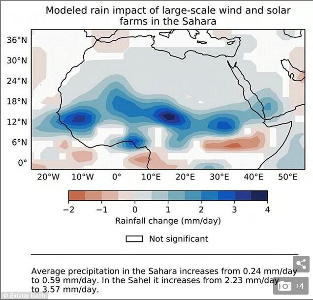 覆蓋廣闊地區(qū)的裝置可以滿足歐洲、中東和非洲的能源需求,以及增加降雨量,最終促進(jìn)植物生長。
