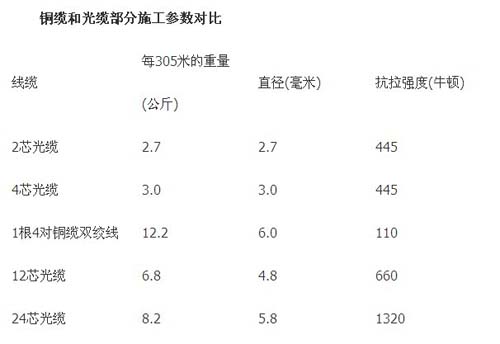 一管雙芯的光纜而言容許彎曲半徑越大、容許抗拉強度越大,為施工留出的余量就越大,施工之后的系統(tǒng)性能就越有保障。從這個方面來說,光纜布線系統(tǒng)的施工也更加容易保證質(zhì)量。見下表所示