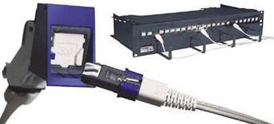 VF-45光纖連接器的平均插入損耗為0.3dB,遠小于TIA/EIA 568所規(guī)定的0.75dB。插座可以安裝在光纖配線架和桌面面板,它的卡口幾何尺寸與RJ-45模塊統(tǒng)一,插座可以安裝在工作區(qū)面板和光纖箱,從而實現(xiàn)端到端的光纖接續(xù)。采用了VF-45光纖連接器的布線系統(tǒng)是把光纖的高帶寬、簡單性、先進性、經(jīng)濟性及可靠性結(jié)合起來的關(guān)鍵器件。見圖六: