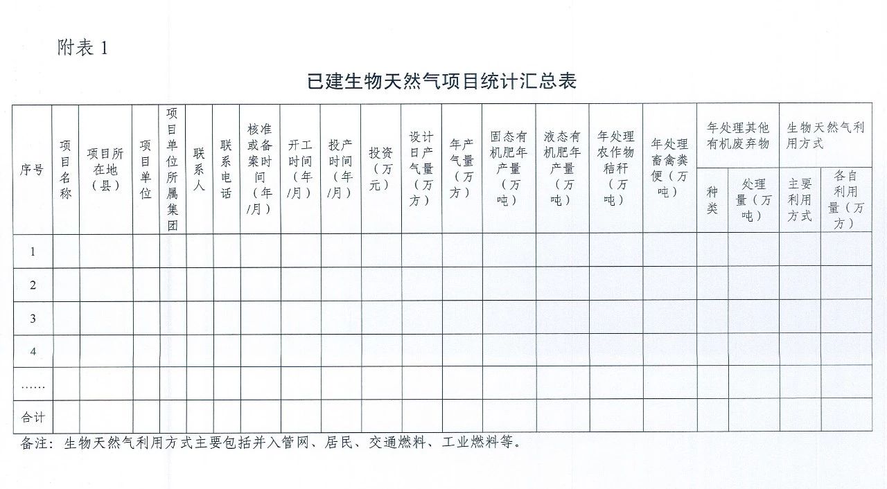 已投產(chǎn)項(xiàng)目情況。包括項(xiàng)目個(gè)數(shù)、總投資、日產(chǎn)氣量、生物天然氣年產(chǎn)量、固態(tài)和液態(tài)有機(jī)肥里量,年處理農(nóng)作物秸稈量、畜禽糞便污量和其他有機(jī)廢棄量、生物天然氣和有機(jī)肥利用方式等。具體項(xiàng)目情況填寫表1。