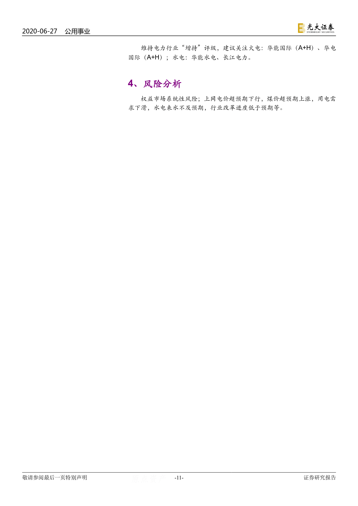 2020年政府工作報(bào)告明確要求“降低工商業(yè)電價(jià) 5%政策延長到今年年底”,對(duì)于發(fā)電側(cè)而言,我們認(rèn)為通過行政性指令降低計(jì)劃電價(jià)的概率較低;在電力市場化改革進(jìn)程加速背景下,市場化規(guī)模的擴(kuò)張可能拉低發(fā)電側(cè)綜合上網(wǎng)電價(jià)水平,但對(duì)于市場化比例基數(shù)較高的火電龍頭公司整體影響有限,市場對(duì)于發(fā)電企業(yè)上網(wǎng)電價(jià)的悲觀預(yù)期有望修復(fù)。“新冠”疫情對(duì)于用電需求構(gòu)成短期沖擊,但在社會(huì)生產(chǎn)恢復(fù)、電力需求復(fù)蘇預(yù)期下火電利用小時(shí)數(shù)提升空間可觀,煤價(jià)仍處于綠色區(qū)間內(nèi),當(dāng)前競爭要素有利于火電基本面持續(xù)回暖,而估值的修復(fù)將取決于市場電改革“質(zhì)變”背景下火電“定價(jià)權(quán)”的實(shí)質(zhì)性提升。