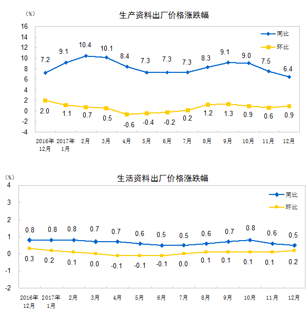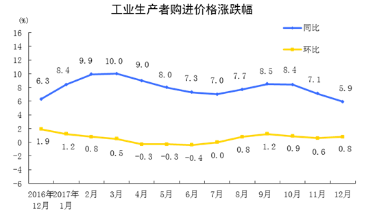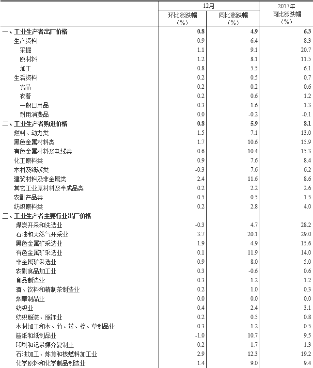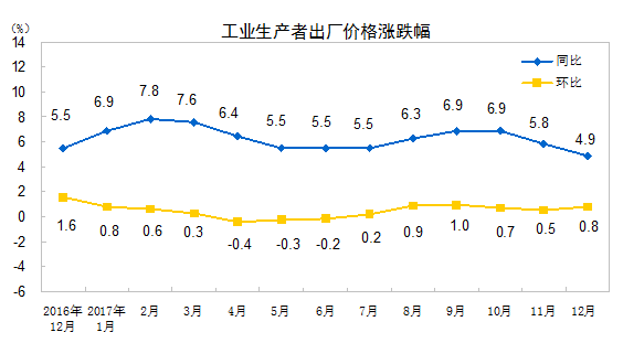 2017年12月份,全國工業(yè)生產(chǎn)者出廠價格同比上漲4.9%,環(huán)比上漲0.8%。工業(yè)生產(chǎn)者購進價格同比上漲5.9%,環(huán)比上漲0.8%。2017年全年,工業(yè)生產(chǎn)者出廠價格同比上漲6.3%,工業(yè)生產(chǎn)者購進價格同比上漲8.1%。