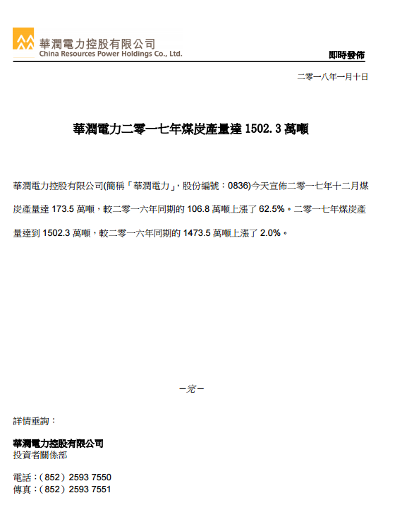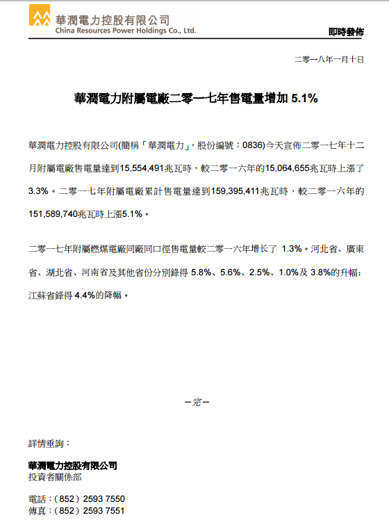 華潤電力2017年12月附屬火電廠售電量同比增長3.9%