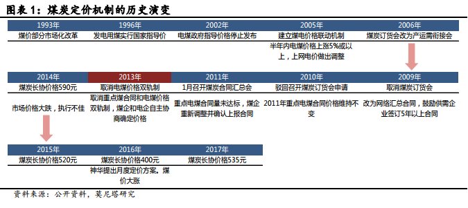 中國在1993年開始進(jìn)行煤炭價(jià)格部分市場化改革(圖表1),政府為了確保電價(jià)穩(wěn)定,設(shè)定了國有大型電廠的電煤價(jià)格,從而形成了“計(jì)劃煤”與“市場煤”之間的價(jià)格雙軌制,但是這也造成了煤電企業(yè)的長期矛盾。“計(jì)劃煤”實(shí)行政府指導(dǎo)價(jià),主要供應(yīng)國內(nèi)大中型電廠(約占煤炭總產(chǎn)量的60%);“市場煤”則主要根據(jù)市場供需情況由企業(yè)自主銷售,價(jià)格由市場來決定(約占煤炭總產(chǎn)量的40%)。在實(shí)際執(zhí)行過程當(dāng)中,“計(jì)劃煤”的價(jià)格遠(yuǎn)低于市場價(jià)格,所以煤炭生產(chǎn)企業(yè)為實(shí)現(xiàn)利益最大化,更傾向于通過市場渠道銷售煤炭,從而造成與發(fā)電企業(yè)重點(diǎn)合同兌現(xiàn)率普遍偏低,發(fā)電企業(yè)則只能通過市場渠道進(jìn)行采購,來彌補(bǔ)煤炭需求缺口。