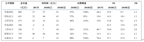 由于今年煤價高企,火電行業(yè)盈利困難,18 年電價調(diào)整將給火電企業(yè)帶來較大的盈利改善空間。經(jīng)過我們測算,僅就電價上漲 1 分而言,將對主要火電企業(yè)帶來的業(yè)績增速就達到 16%-90%;如果再疊加煤炭成本下降5%,火電企業(yè)業(yè)績增長將達到 37%-236%。主要火電企業(yè)的市盈率估值水平將從現(xiàn)在 20 多倍左右的水平回落到10 倍左右。
