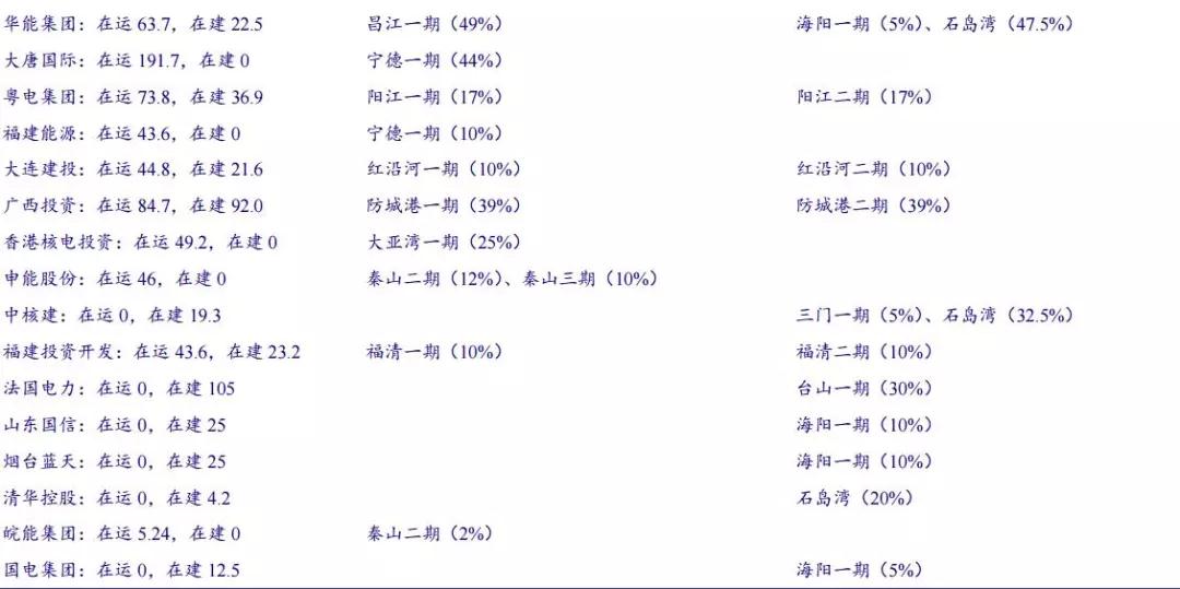 各大發(fā)電集團(tuán)積極布局。除了三家具有控股資質(zhì)的核電巨頭外,華能、大唐、國(guó)電、華電也分別參股了數(shù)個(gè)已投運(yùn)及在建的核電項(xiàng)目。福能、浙能、申能、粵電等地方能源集團(tuán)在本省的核電項(xiàng)目中擁有一定股權(quán)。