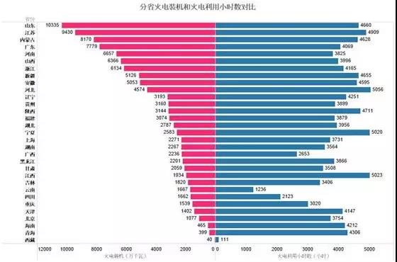 截至2017年年底分省火電裝機和利用小時排名及對比
