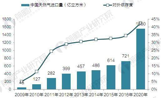 圖表 4:2009-2020 年我國天然氣進(jìn)口量及對外依存度(單位:億立方米,%)