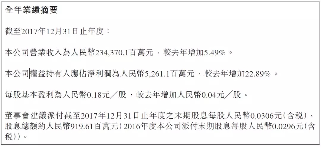 2017年,本公司實現(xiàn)營業(yè)收入2343.701億元,同比增長5.49%。實現(xiàn)歸屬于本公司權(quán)益持有人的凈利潤52.611億元,同比增長22.89%。董事會建議派付至2017年12月31日止年度之末期股息每股0.0306元(含稅),股息總額約9.1961億元,待股東周年批準(zhǔn)后生效。