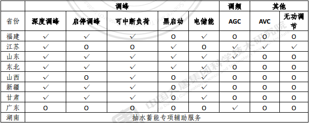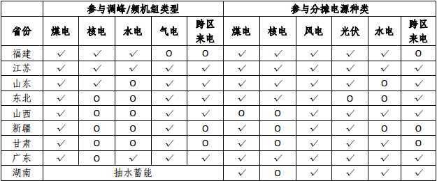 注:√表示該省份輔助服務市場包含此項輔助服務,O表示該省份輔助服務市場不包含此項輔助服務。