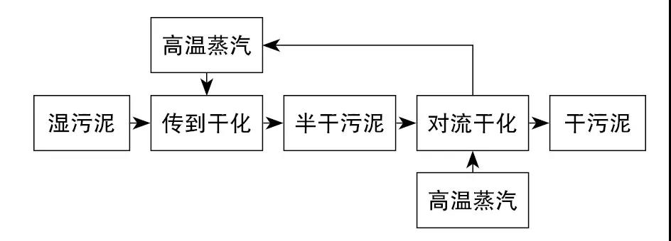 以高溫蒸汽為熱介質(zhì),濕污泥通過(guò)加料器進(jìn)入一級(jí)以傳導(dǎo)為主的干化設(shè)備內(nèi),其熱介質(zhì)來(lái)自于二級(jí)對(duì)流干化所產(chǎn)生的多余高溫蒸汽,經(jīng)過(guò)一級(jí)傳導(dǎo)干化后的半干污泥送入二級(jí)對(duì)流干化設(shè)備內(nèi)。