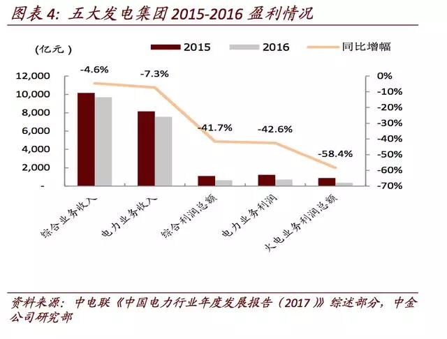 利用小時(shí)自2011年呈下跌趨勢(shì)。根據(jù)中電聯(lián)發(fā)布的《中國(guó)電力行業(yè)年度發(fā)展報(bào)告(2017)》綜述部分提供的數(shù)字來(lái)看,五大發(fā)電集團(tuán)(華能、華電、國(guó)電、大唐、國(guó)電投)在2016年電力業(yè)務(wù)收入同比下降7.3%,電力業(yè)務(wù)利潤(rùn)同比下降42.6%,其中火電業(yè)務(wù)利潤(rùn)大幅下滑58.4%。