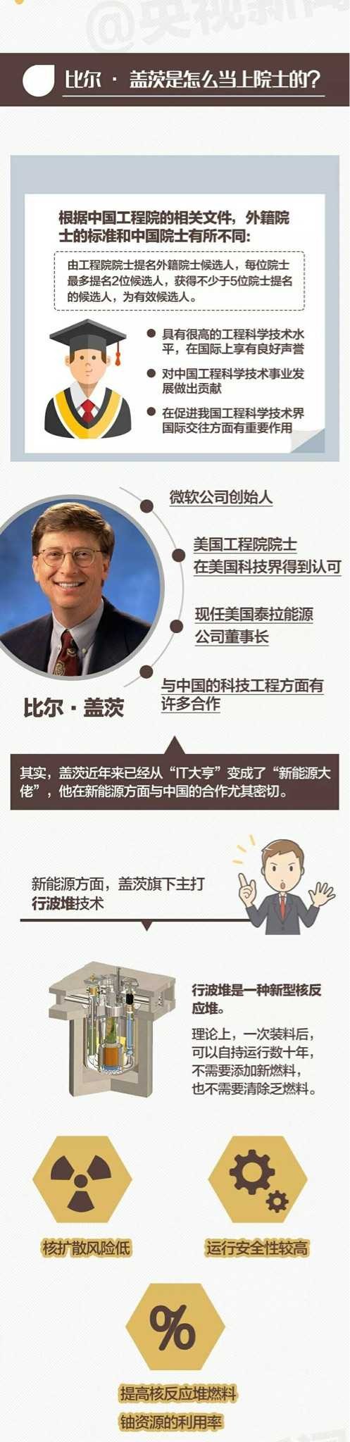 入選中國工程院院士需要有較高的科學(xué)技術(shù)水平和良好的聲譽,對中國工程科學(xué)技術(shù)發(fā)展有突出貢獻,在促進中國工程科學(xué)技術(shù)界國際交往方面有重要作用。而比爾˙蓋茨本身的實力,以及在新能源領(lǐng)域的一系列舉動可能是他榮獲中國工程院外籍院士頭銜的根源。