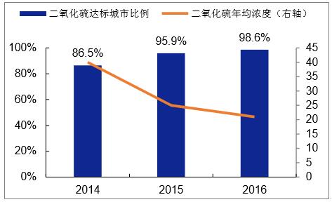 得益于十二五期間火電領(lǐng)域等大氣治理的嚴(yán)格實(shí)施,全國(guó)74座城市以及京津冀地區(qū)的二氧化硫、二氧化氮濃度已有較顯著好轉(zhuǎn),但超細(xì)顆粒物的濃度依舊嚴(yán)重超標(biāo)。根據(jù)國(guó)家環(huán)保部發(fā)布的歷年中國(guó)環(huán)境狀況公告,我國(guó)74個(gè)城市的二氧化硫的年均濃度已從2014年的40微克/立方米下降至2016年的21微克/立方米,在2016年二氧化硫打標(biāo)的城市已達(dá)到98.6%,成效顯著。但在細(xì)顆粒物方面,74個(gè)城市的PM2.5年均濃度雖然從2014年的72微克/立方米下降至2016年的50微克/立方米,打標(biāo)城市占比從4.1%提升至18.90%,有所改善,但在全國(guó)范圍內(nèi)的PM2.5污染依舊超標(biāo)嚴(yán)重。