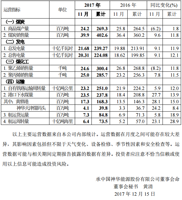 中國(guó)神華11月份運(yùn)營(yíng)數(shù)據(jù):11月份總發(fā)電量216.8億千瓦時(shí) 同比增長(zhǎng)6.1%