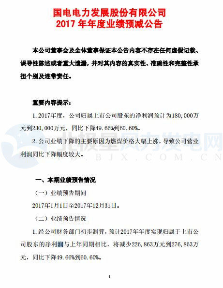 國電電力預(yù)計(jì)2017年凈利潤同比下降22.69億元到27.69億元