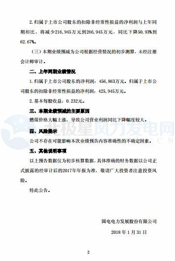 國電電力預(yù)計(jì)2017年實(shí)現(xiàn)歸屬于上市公司股東的凈利潤與上年同期相比,將減少226,863萬元到276,863萬元,同比下降49.66%到60.60%。