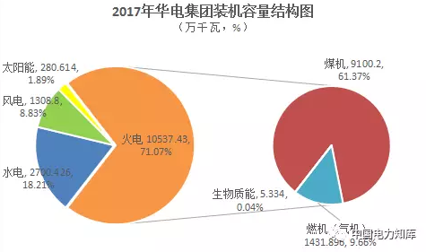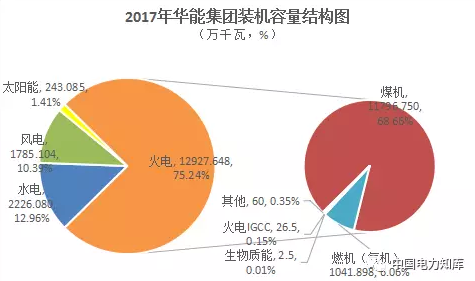 2017年,華能集團裝機容量為17181.917萬千瓦,同比增長3.79%,其中,水電2226.08萬千瓦,火電12927.648萬千瓦,風電1785.104萬千瓦,太陽能發(fā)電243.085萬千瓦;大唐集團裝機容量為13775.814萬千瓦,同比增長6.23%,其中,水電2685.099萬千瓦,火電9470.48萬千瓦,風電1519.665萬千瓦,太陽能發(fā)電100.57萬千瓦;華電集團裝機容量為14827.27萬千瓦,同比增長3.82%,其中,水電2700.426萬千瓦,火電10537.429萬千瓦,風電1308.8萬千瓦,太陽能發(fā)電280.614萬千瓦;國家電投集團裝機容量為12612.51萬千瓦,同比增長8.14%,其中,水電2203.003萬千瓦,火電7423.394萬千瓦,風電1372.71萬千瓦,太陽能發(fā)電1165.88萬千瓦,其他447.516萬千瓦。