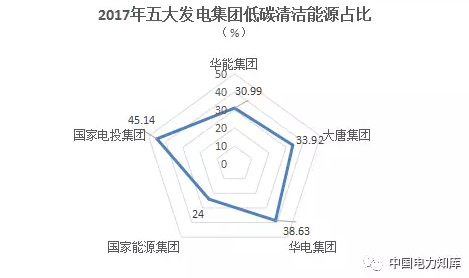 2017年,國家電投集團低碳清潔能源比重最高,為45.14%,華電集團次之,為38.63%,接下來分別是大唐集團33.92%,華能集團30.99%,國家能源集團24%。