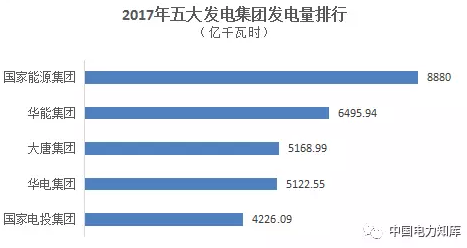 2017年,國家能源集團發(fā)電量最高,為8880億千瓦時,華能集團以6495.94億千瓦時次之,接下來分別是大唐集團5168.99億千瓦時,華電集團5122.55億千瓦時,國家電投集團4226.09億千瓦時。