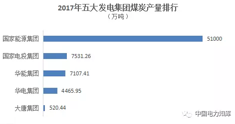 2017年,國家能源集團全年煤炭產(chǎn)量為5.1億噸,位列第一,國家電投集團次之,為7531.26萬噸,接下來分別是華能集團7107.41萬噸,華電集團4465.95萬噸,大唐集團520.44萬噸。