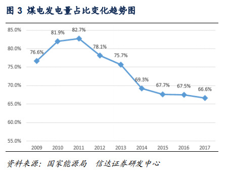 作為以煤為主的資源型國家,我國的發(fā)電能源也是以電煤為主。近年來,發(fā)電裝機(jī)容量中60%是煤電,發(fā)電量中約70%是煤電。一方面,按照目前的技術(shù)成熟度和成本優(yōu)勢來看,煤電是我國最穩(wěn)定的配套電源,我國煤電規(guī)模巨大,年均發(fā)電量在40000億千瓦時左右,據(jù)最新統(tǒng)計(jì)數(shù)據(jù)顯示,2017年,煤電發(fā)電量約為42000億千瓦時,在發(fā)電量中約占66.7%,雖然比2016年發(fā)電量占比67.5%略有回落,但煤電亦向高效清潔利用轉(zhuǎn)型,其他任何能源在今后相當(dāng)長時間內(nèi)還不可能完全取代煤電在電源結(jié)構(gòu)中的核心地位;另一方面,近年來煤電發(fā)電量占比一直在降低,進(jìn)入“十三五”以來,煤電發(fā)電量占比降速逐漸放緩,也就是說,為保障我國未來用電剛性需求,未來煤電將更多地承擔(dān)支撐電力系統(tǒng)運(yùn)行、給系統(tǒng)調(diào)峰等作用,但煤電仍是我國的主力電源,在電力系統(tǒng)中的主體地位不會發(fā)生變化。