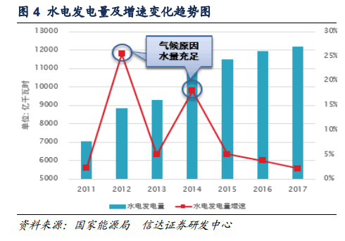 我們預(yù)測,2018年,全社會用電量增速6%的情況下,全社會用電量增長約為4000億千瓦時,按照各類電源發(fā)電量結(jié)構(gòu)測算,煤電增長約2640億千瓦時,折合成標(biāo)煤約為3245萬噸,也就是說對應(yīng)原煤消費(fèi)增長4543萬噸,引發(fā)煤炭消費(fèi)部分修復(fù);相應(yīng)水電發(fā)電量增長約800億千瓦時,氣電、并網(wǎng)風(fēng)電發(fā)電量增長200億千瓦時,并網(wǎng)太陽能發(fā)電、核電發(fā)電量增長80億千瓦時左右。