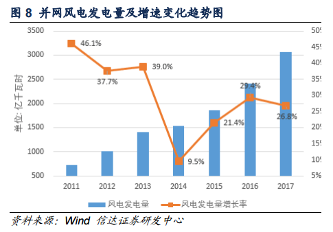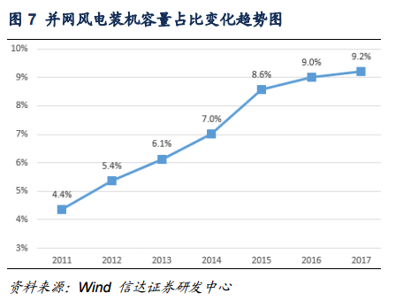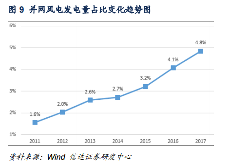 從發(fā)電量角度而言,2017年水電發(fā)電量約為12211億千萬時,水電發(fā)電量增速由2016年的3.8%降至2.2%,水電發(fā)電量在全國全社會用電量中的占比也由2016年的20.2%降至2017年的19.4,這主要是因?yàn)樽罱鼉赡隁夂蛟驅(qū)е碌乃坎粔虺渥悖磥砦覀冾A(yù)計(jì)水電發(fā)電量在全社會用電量中的占比將維持在20%左右;近年來,風(fēng)電裝機(jī)容量在發(fā)電設(shè)備裝機(jī)總量中的占比不斷提高,2017年,風(fēng)電發(fā)電量約為3057億千瓦時,約占全社會用電量的4.8%,并網(wǎng)風(fēng)電裝機(jī)容量占比達(dá)到9.2%,整體上呈現(xiàn)逐漸上升的趨勢。