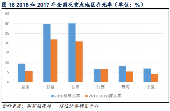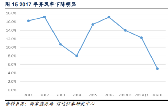 2017年,我國重點(diǎn)省份及主要河流(河段)利用良好,除了金沙江中游和大渡河地區(qū)水能利用率不到70%,其他地區(qū)和河流水能利用率都在85%以上;2017年,棄風(fēng)問題有所緩解,全國風(fēng)電發(fā)電量3057億千瓦時,設(shè)備平均利用小時1948小時、同比提高203小時。棄風(fēng)電量419億千瓦時,同比減少78億千瓦時。2017年,全國光伏發(fā)電量1568.2億千瓦時,全國棄光電量73億千瓦時。全國棄光率5.6%,同比下降了3.8個百分點(diǎn)??梢钥闯?,2017年的棄風(fēng)、棄光情況較2016年下降了不少,但離國家規(guī)劃的2020年棄風(fēng)率5%以內(nèi)、棄光率3%以內(nèi)的目標(biāo)還有一定距離。隨著棄水棄風(fēng)棄光問題的解決,煤電發(fā)電份額將下降。
