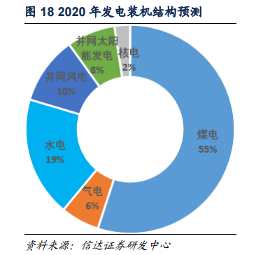 2018年能源工作會議提出,要聚焦綠色發(fā)展,著力解決清潔能源消納問題。按照非化石能源消費(fèi)比重達(dá)到15%左右的要求,到2020年,非化石能源發(fā)電裝機(jī)將達(dá)到7.7億千瓦左右,按照煤電“去產(chǎn)能”及清潔能源消納的相關(guān)政策要求,我們預(yù)測,到2020年:全國發(fā)電裝機(jī)容量約為20億千瓦,其中煤電裝機(jī)容量不會超過11億千瓦,氣電裝機(jī)容量將達(dá)到1.2億千瓦,常規(guī)水電裝機(jī)將達(dá)到3.7億千瓦,風(fēng)電裝機(jī)將達(dá)到2.1億千瓦,太陽能發(fā)電裝機(jī)將達(dá)到1.5億千瓦,核電裝機(jī)將達(dá)到0.5億千瓦,非化石能源發(fā)電裝機(jī)總量將達(dá)到7.8億千瓦左右。到2020年,煤電的電源結(jié)構(gòu)占比將由2017年的58%降至55%,煤電“去產(chǎn)能”將微調(diào)電源結(jié)構(gòu)。