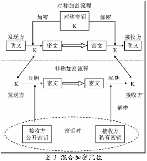混合加密技術不是一種單一的加密技術,而是一個結合體,是上述兩種數(shù)據(jù)加密技術相互結合的產物。通信雙方的通信過程分為兩個部分,雙方先利用非對稱加密技術傳送本次通信所用的對稱密鑰,然后再用對稱加密技術加密傳送文件。混合加密流程如圖3所示。