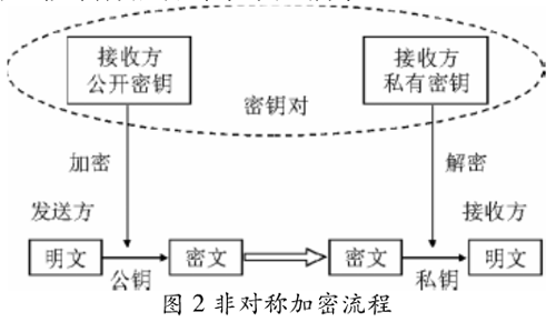 這種技術也可以稱為公鑰加密技術,加密密鑰(公鑰)可以公開,即陌生人可以得到它并用來加密信息,但只有用相應的解密密鑰(私鑰)才能解密信息。比較著名的公鑰密碼算法有:RSA、背包密碼、McEliece密碼、Hellman、Rabin、橢圓曲線算法等等,最有影響的公鑰密碼算法是RSA,它能抵抗到日前為止已知的所有密碼攻擊。公鑰密碼的優(yōu)點是可以適應網(wǎng)絡的開放性要求,但速度比較慢,不太適合對文件進行加密。非對稱加密流程如圖2所示。