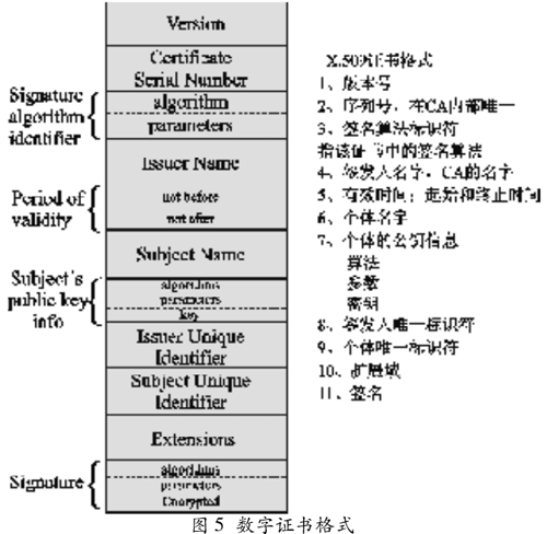 數(shù)字證書證明證書持有者身份的電子介質,由證書頒發(fā)機構(CA)簽發(fā),至少包含一個公開密鑰、證書持有人(或單位)的名稱以及證書授權中心對這些信息的數(shù)字簽名的文件。一個證書中,最重要的信息是個體名字、個體的公鑰、機構的簽名、算法和用途。證書的格式遵循ITUTX. 509 (v1.0、v2.0、v3.0)國際標準。數(shù)字證書的格式如圖5所示。