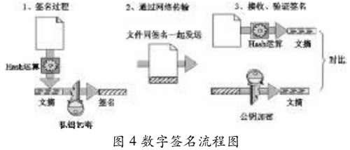 所謂”數(shù)字簽名”就是通過某種密碼運算生成一系列符號及代碼組成電子密碼進行簽名。數(shù)字簽名的概念由WhitfiedDiffie和MaitinHellman于1976年最先提出,目的是使簽名者對電子文件也可以進行簽名并且無法否認,驗證者無法篡改文件。數(shù)字簽名由簽名算法和驗證算法構成,數(shù)字簽名如圖4所示。