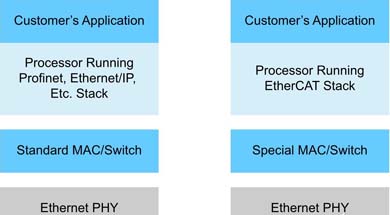 EtherCAT 和 Profinet IRT 是兩種較新的協(xié)議,需要特殊的 MAC 設(shè)計(jì)。特別是EtherCAT 使用了創(chuàng)新的方法,在一個(gè)以太網(wǎng)幀中封裝了更多的數(shù)據(jù)包。多個(gè)從機(jī)器件的數(shù)據(jù)被封裝到一個(gè)以太網(wǎng)幀中。當(dāng)從機(jī)器件讀取以太網(wǎng)幀時(shí),它必須為自己提取出數(shù)據(jù)包的內(nèi)在含義,而忽略其他信息。更重要的是,它必須隨時(shí)進(jìn)行這種提取工作。