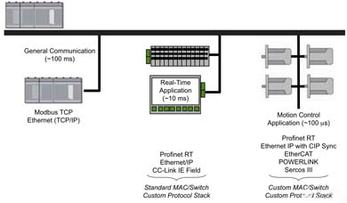 為支持所選擇的協(xié)議,從機(jī)器件中的 MAC 設(shè)計(jì)不同于傳統(tǒng)的以太網(wǎng) MAC,需要 FPGA 或者 ASIC 中的特殊設(shè)計(jì)。從系統(tǒng)設(shè)計(jì)的角度看,如果您必須支持標(biāo)準(zhǔn) MAC 實(shí)現(xiàn)以及特殊實(shí)現(xiàn),那么,設(shè)計(jì)應(yīng)包含 MAC 設(shè)計(jì),或者是硬件可編程的。圖 2 顯示了不同的實(shí)時(shí)要求是怎樣導(dǎo)致通信協(xié)議標(biāo)準(zhǔn)不同體系結(jié)構(gòu)的。